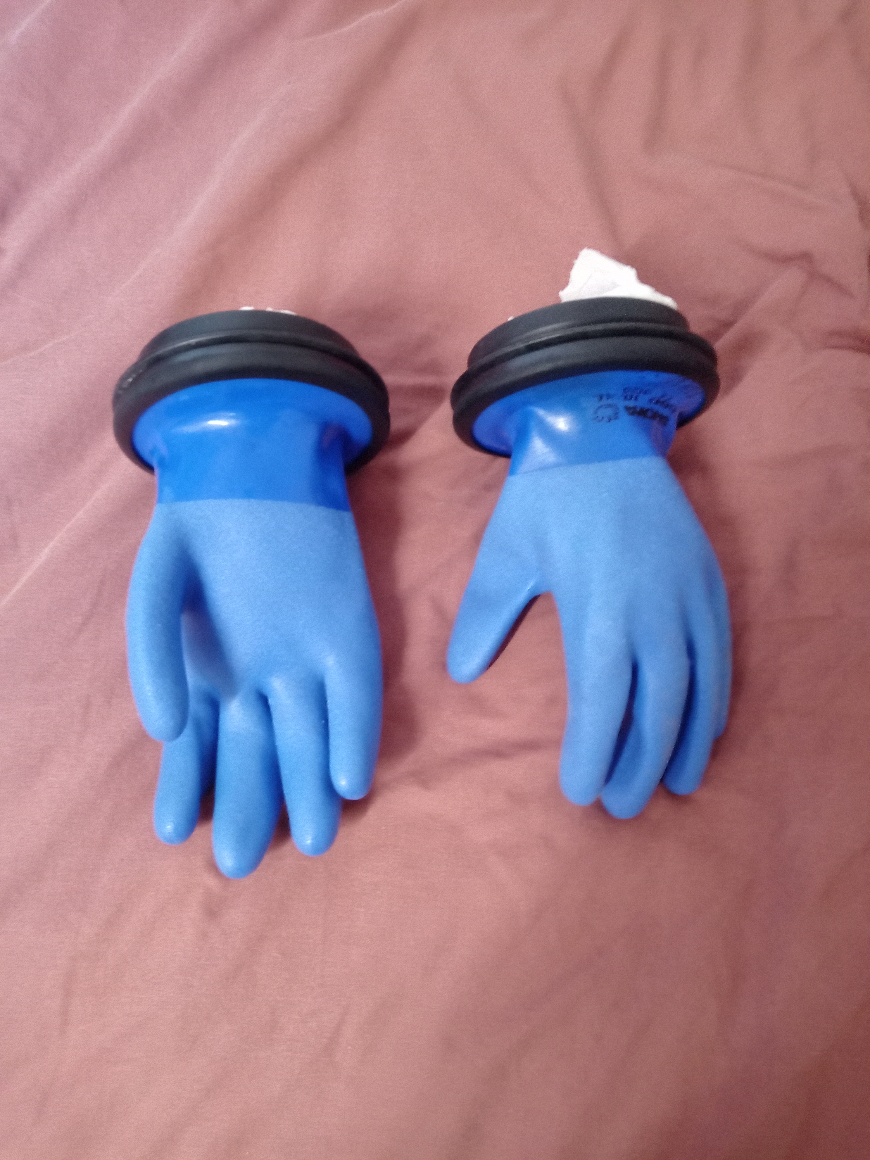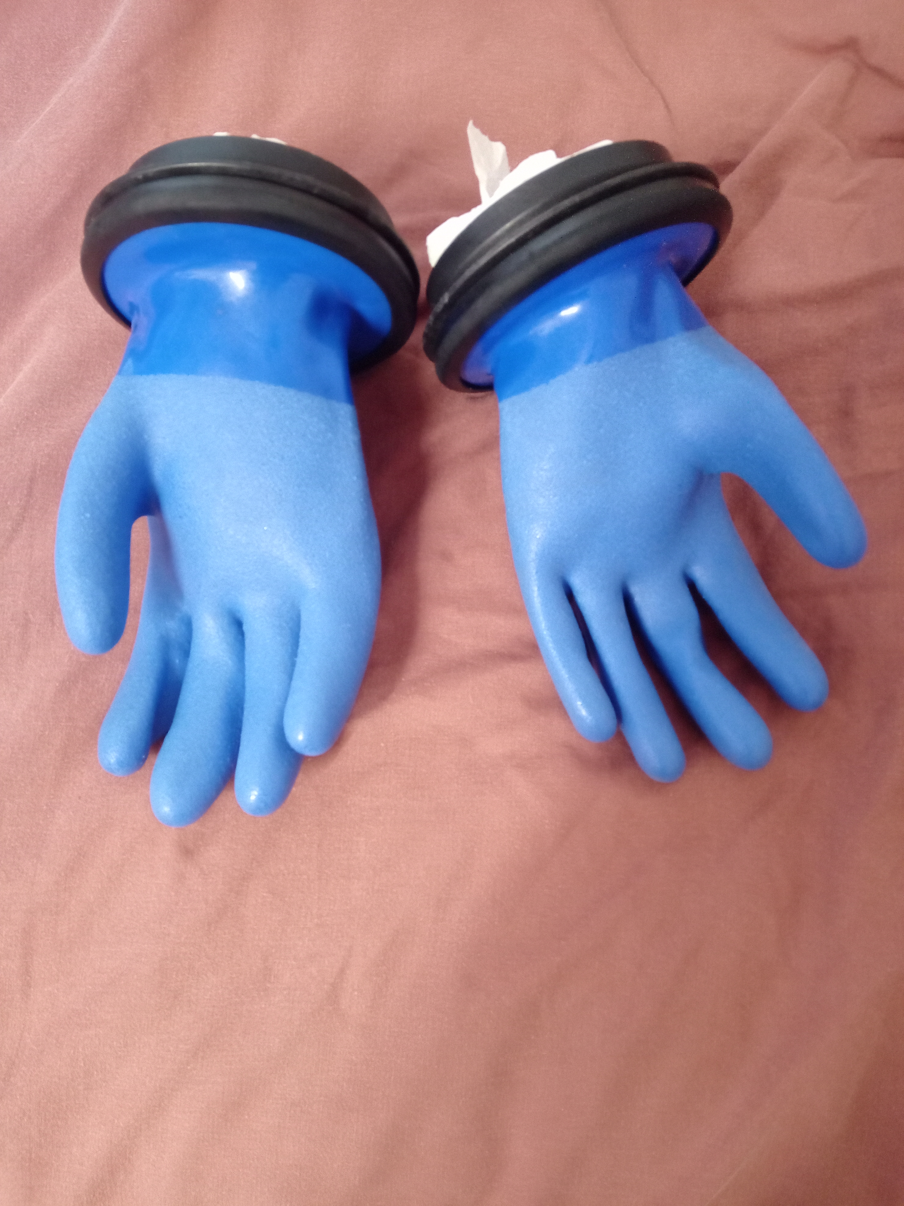 J'ai changé les gants à l'origine en latex pour des plus solide , les bleu sur les photos , la taille est ML "moyenne" c'est gants se changent très facilement.